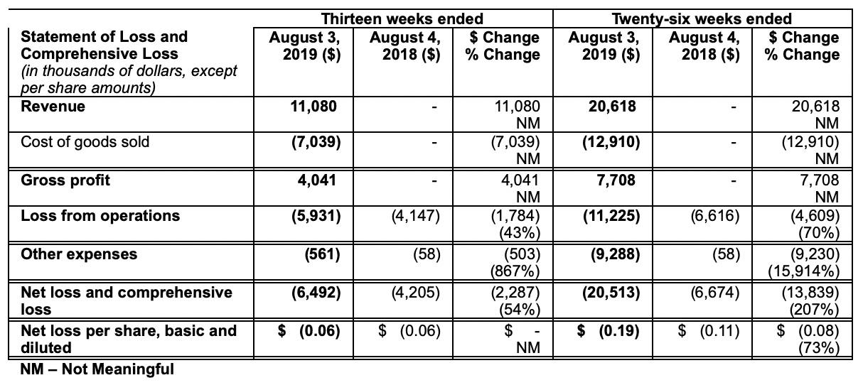 During the thirteen weeks ended August 3, 2019, the Company generated revenue of $11.1 million including cannabis and cannabis-related accessory sales of $9.7 million, wholesale sales of $0.9 million and digital development revenue of $0.5 million. During the thirteen weeks ended May 4, 2019, the Company generated revenue of $9.5 million including cannabis and cannabis-related accessory sales of $7.7 million, wholesale sales of $1.3 million and digital development revenue of $0.5 million. Revenues are expected to continue to increase as the Company acquires new licences, opens additional retail cannabis stores, and continues to commercialize the HifyreTM digital retail and analytics platform subject to the issuance of new licences and the entry of the Company into new markets.